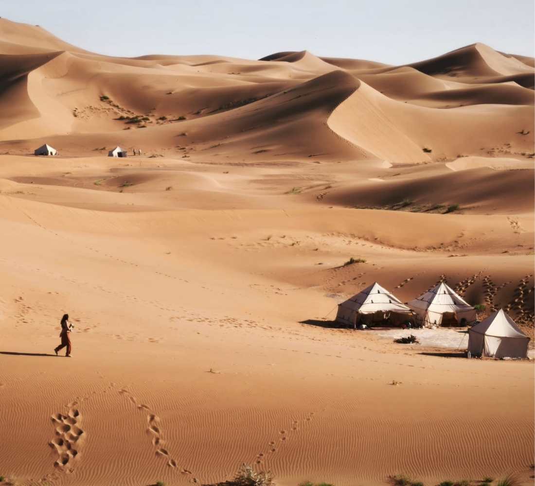 Dès le jour 2, vous partirez vivre une expérience pour explorer la vie nomade des hommes du désert ; la première et la dernière nuit au désert auront lieu dans le bivouac fixe tout confort, basé à quelques kms de Mhamid El Ghizlane, en tente partagée. Ensuite, vous partirez au cœur du désert en marchant, accompagnés d'une équipe professionnelle de nomades et de la caravane à dromadaire, qui porte toutes les affaires du bivouac et vos affaires personnelles.