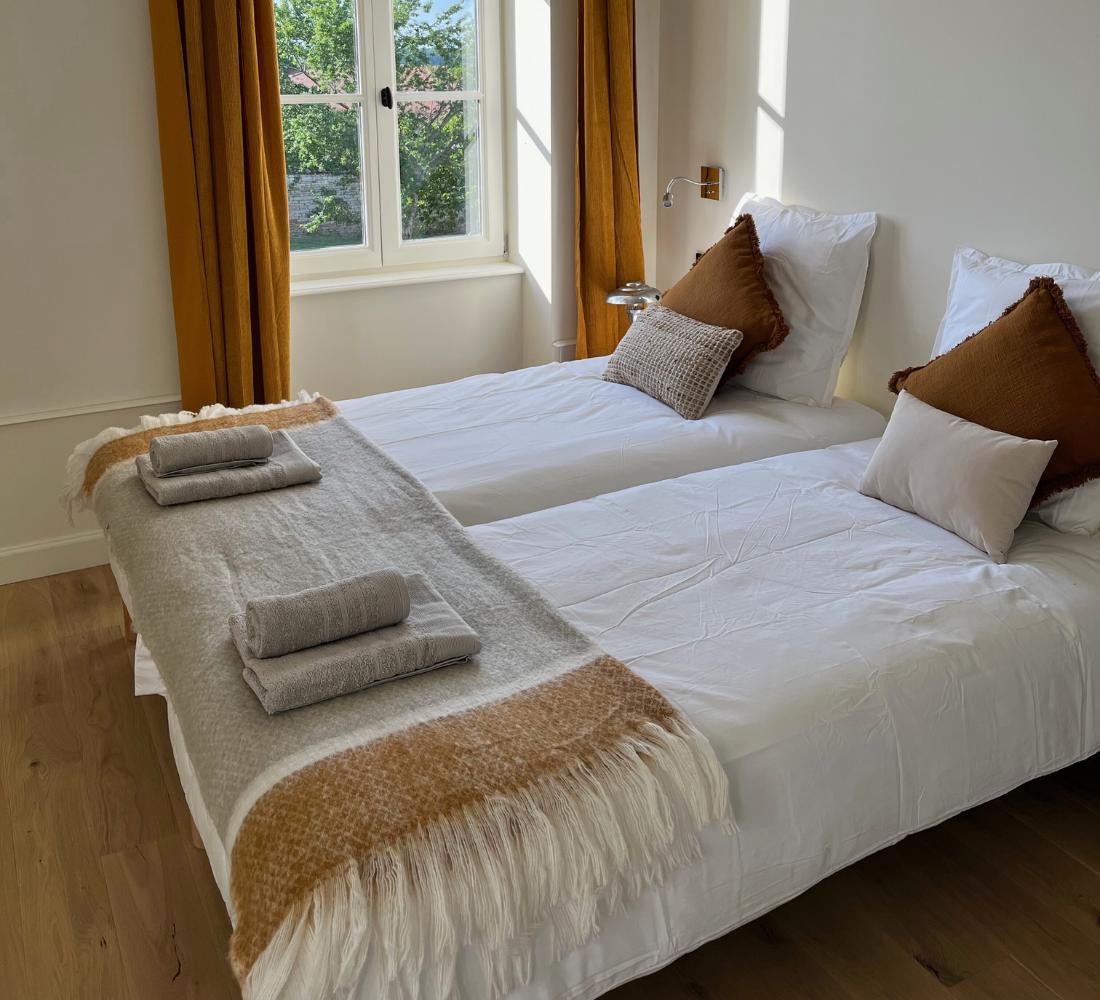 Que vous preniez votre petit-déjeuner au coin du feu ou sur la terrasse fleurie, que vous admiriez la vue imprenable sur le clocher roman ou que vous flâniez dans le parc arboré, tout ici invite à l’apaisement et à l’émerveillement.